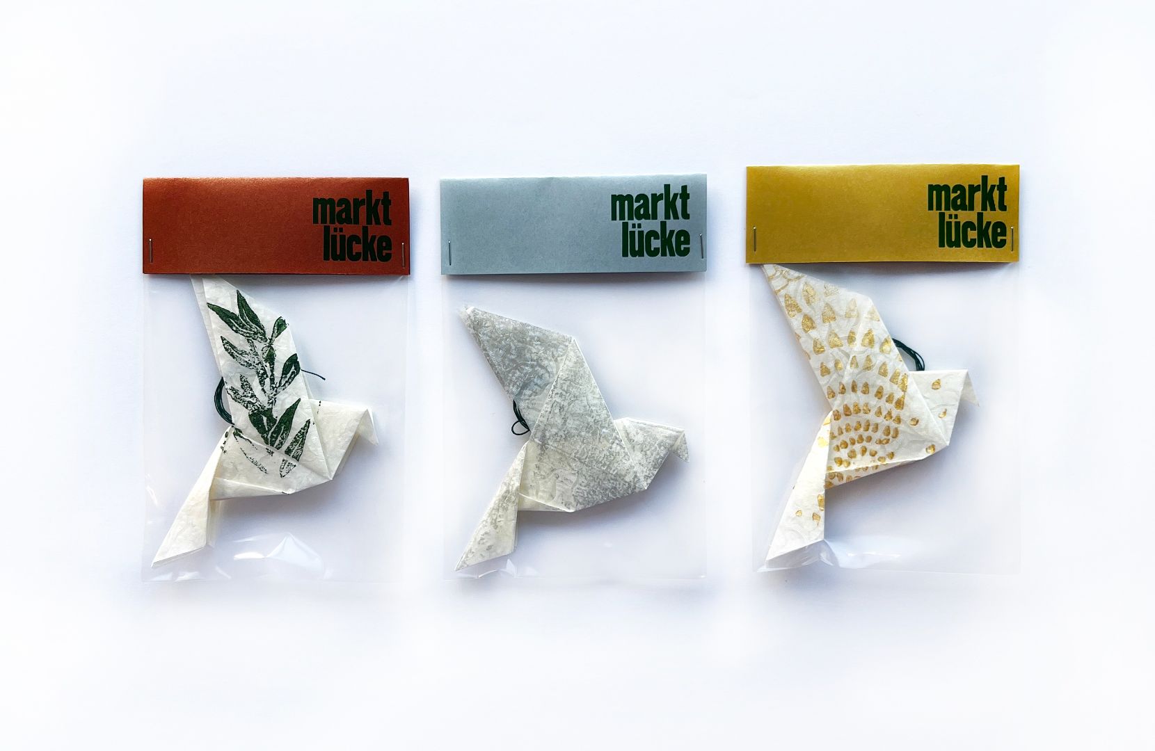 Mit einem Stapel ausrangiertem Confiserie-Papier hat diese Produkte-Geschichte ihren Anfang genommen. Ebendiesen Stapel nahm sich unsere Praktikantin als Ausgangslage um ein neues Produkt zu entwickeln. Aus dem Papier mit zartem Muster und leichter Transparenz, welches sich je nach Licht in unterschiedlichen Nuancen präsentiert, falten wir nun in unserer Werkstatt Friedenstauben. Danach bedrucken wir diese von Hand mit Linolfarbe in drei Varianten. Der hoffnungsvolle Hingucker eignet sich als Geschenk, als Dankeschön oder als Mobile und ist bei uns im Laden oder Onlineshop erhältlich. Als Kund*innenauftrag: Die Etikette unserer Friedenstauben-Aufhänger lässt sich leicht zu einer Dankeskarte, Einladung oder nach den Wünschen unserer Auftraggeber*innen umformulieren.