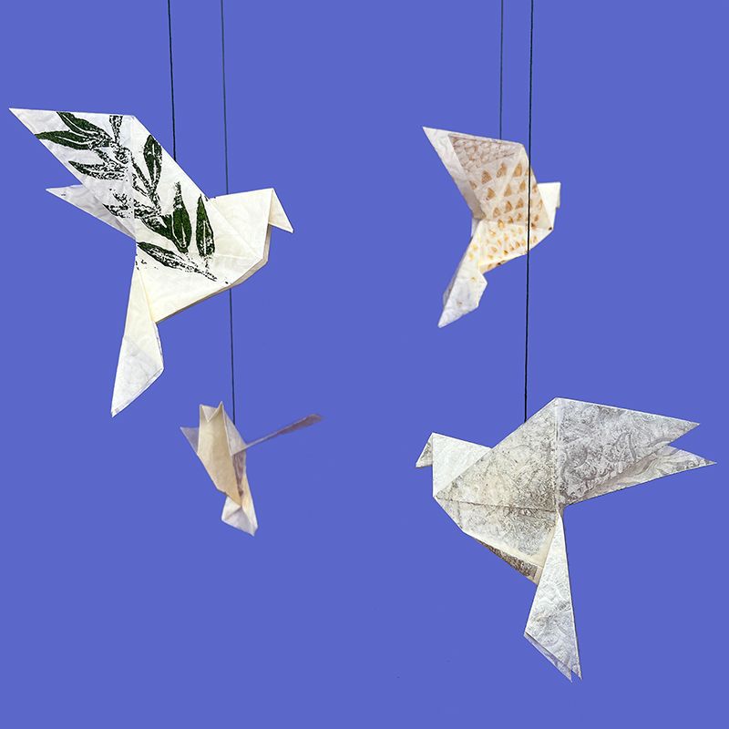 Mit einem Stapel ausrangiertem Confiserie-Papier hat diese Produkte-Geschichte ihren Anfang genommen. Ebendiesen Stapel nahm sich unsere Praktikantin als Ausgangslage um ein neues Produkt zu entwickeln. Aus dem Papier mit zartem Muster und leichter Transparenz, welches sich je nach Licht in unterschiedlichen Nuancen präsentiert, falten wir nun in unserer Werkstatt Friedenstauben. Danach bedrucken wir diese von Hand mit Linolfarbe in drei Varianten. Der hoffnungsvolle Hingucker eignet sich als Geschenk, als Dankeschön oder als Mobile und ist bei uns im Laden oder Onlineshop erhältlich. Als Kund*innenauftrag: Die Etikette unserer Friedenstauben-Aufhänger lässt sich leicht zu einer Dankeskarte, Einladung oder nach den Wünschen unserer Auftraggeber*innen umformulieren.