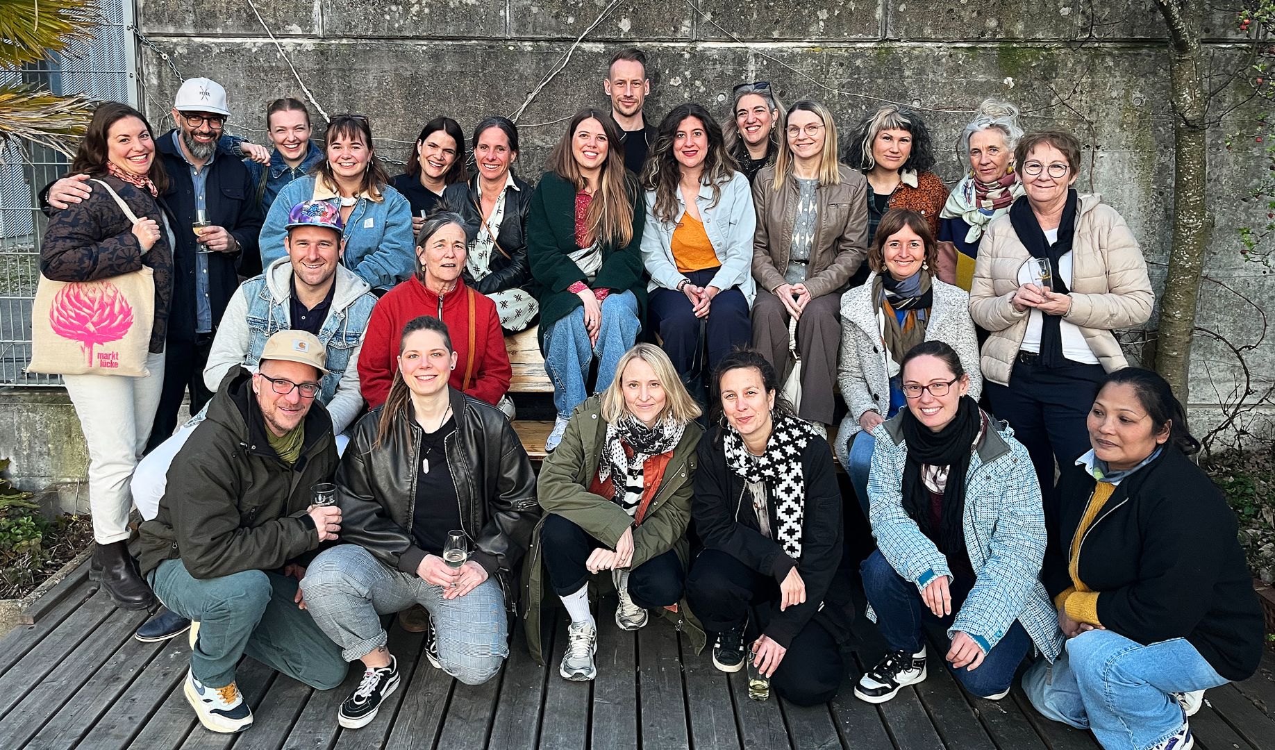 Obere Reihe von Links: Maria Brosi, Werkstatt. Seç Ergin, ehem. Katja Suter, ehem. Leonie Leal Paredes, Restaurant/ Sozialberatung. Anna Jäger, Sozialberatung. Irina Ruf, Restaurant. Melina Heller, Restaurant. Kevin Jacob, Laden. Khadija Schaub-Itani, Sozialberatung. Grace Ruoss, Laden. Anna Singh, Restaurant. Lorena Lopez, Werkstatt. Claudine Hartung, Gesellschafterin.